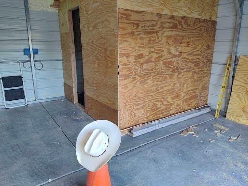 All that plywood I had, really came in handy. 🤠I was lucky that all the sheets of plywood were ½ inch except one piece that was a ¾ inch. I’m not sure where that piece came from, but I used it. It serves as a strong kick plate on the door entrance side. You can see it, kind of even with my hat below. That lovely Resistol Hat, I got for a heck of a deal, on Amazon check Amazon deals here I know my perfect size is 7 1/4 and it is a 10xxxxxxxxxx quality hat.🤠