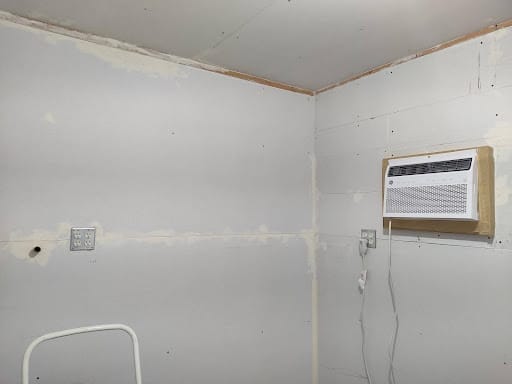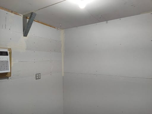 There is a trick to installing the ceiling by yourself, but I chose to get my son to help me. LOL! 🤠One full sheet and the second one had to be stripped as a three feet wide and notched out for the metal brace of the shop. I had an old half box of drywall nails, but my son suggested screws. Screws offer a more secure and reliable hold, especially over time. A little bit more expensive, but both can be purchased at any of my Retailers or even Amazon🤠 Over all, I used a little less than nine full sheets of drywall. If you look closely at my pictures, the A/C wall, I decided to utilize all the extra trimmed off pieces. No waste! $