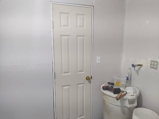 I will seal around the door frame and then I will be ready to plaster and paint. To the right, you can also see my hand washing canister. I also installed that blue handle water valve. This water valve and extension pipe was purchased at Home Depot , but you can find them at any of my other retailers, Lowes and or Amazon .