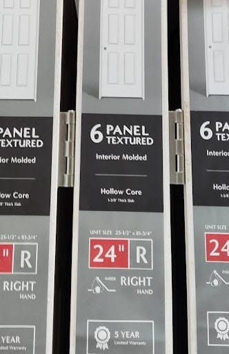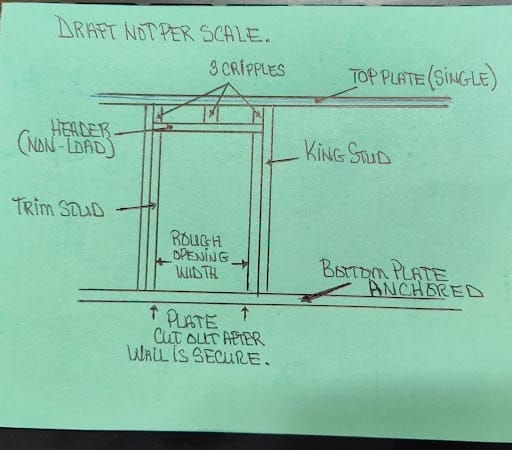 In my draft, I wrote 26 ½” wide, 82 ½” height for a rough opening. This purchase at Home Depot shows * Unit Size 25 ½” x 81 ¾”. That is the actual size of the door plus the door frame in the box. This allows room to level the door and utilize spacers as needed. My little green draft/sketch above shows where I will cut out that part of the bottom plate before installing the door. I will get down on my knees, wearing my knee padded work pants. Again, probably my best purchase ever, at any Walmart.