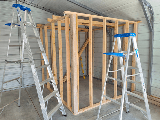 I utilized these 2 inch wood screws on all the frame work. I attached studs to the bottom plates and the top plates first. Again, 16 inch on center. The first wall with no door or windows went up and anchored. For this small of a build, I will not place a “Double Top Plate”. On the next wall, with a doorway, I will put together the Studs and the King Studs for the doorway. All attached on the concrete floor, then raised and placed onto the anchors. I will now go and tighten all the nuts of the anchors. Looking GOOD! I feel like the Amish.🤠 LOL! Next, I attached the Trimmer, the Header and the Top cripples for the doorway.