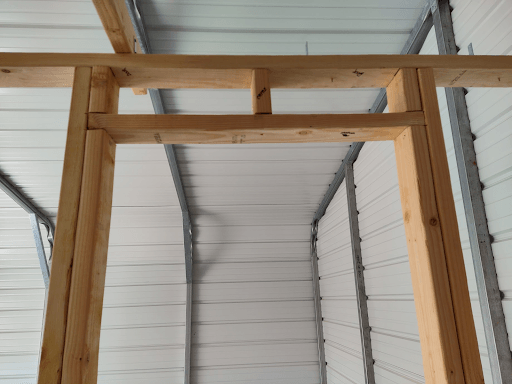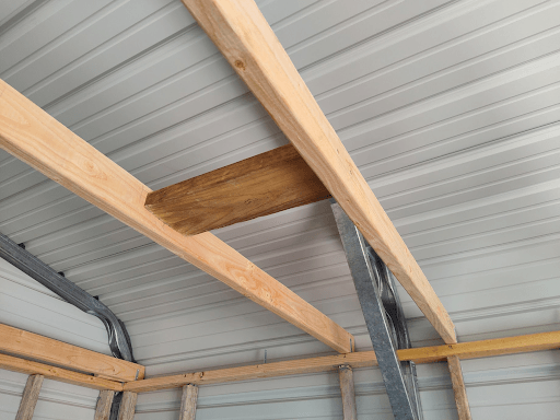 Above is a picture of the 2”x6” in between the two center Joist for ceiling light and maybe a ceiling fan later. Y’all can also see the 2”x3”s, snug fitted and liquid nailed to the metal walls. Once secure, I drilled a 2” screw through the top plate down into each 2”x3”.